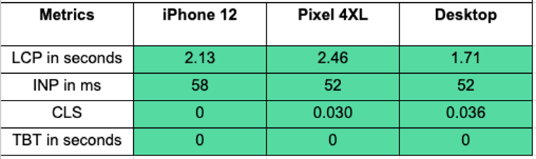 Bazaarvoice’s Hosted Display team’s objective is to ensure CWV metrics (LCP, INP, CLS, and TBT) for desktop, Android, and IOS are all maintained at "good" levels.